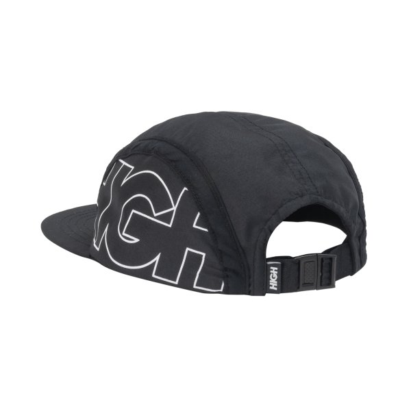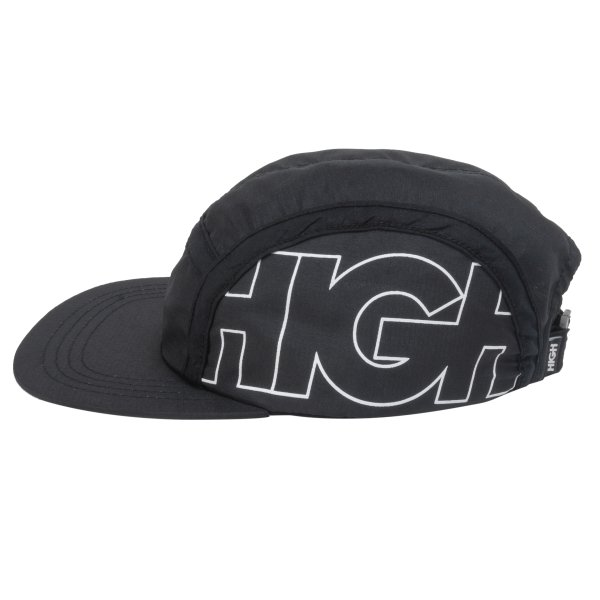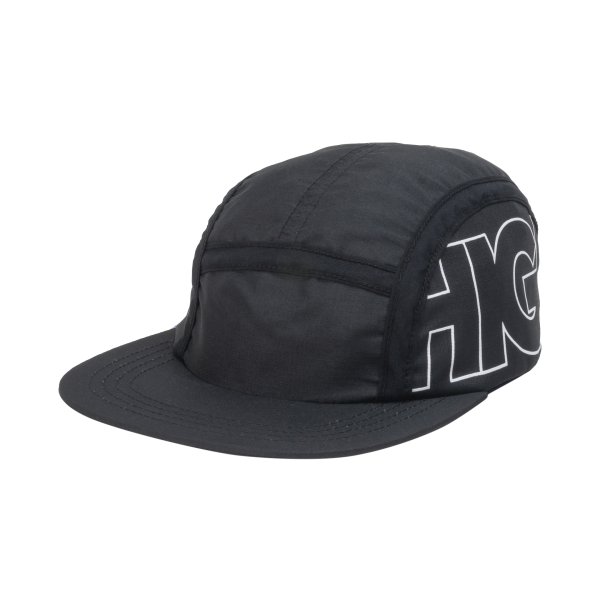 Boné 5 panel com tecido resistente a água, viés externo nos painéis e logo outline em silk na lateral. Fecho tic-tac com fita personalizada.