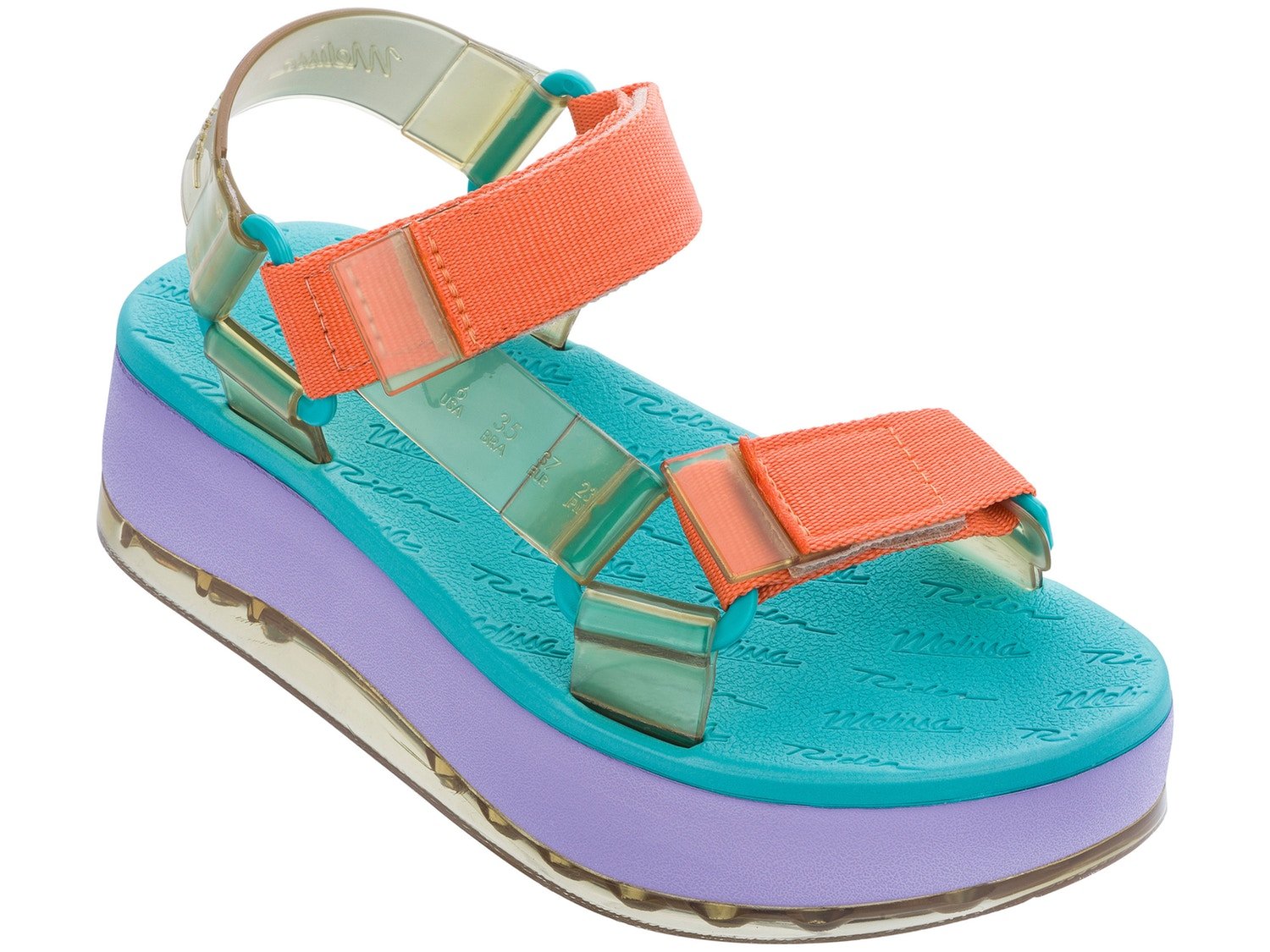 Nova versão com plataforma da Melissa Papete + Rider. A collab de sucesso vem em um modelo com atitude, personalidade cool e conforto no volume máximo. Destaque para o mix de materiais com detalhes transparentes no solado e o super moderno fechamento com velcro.